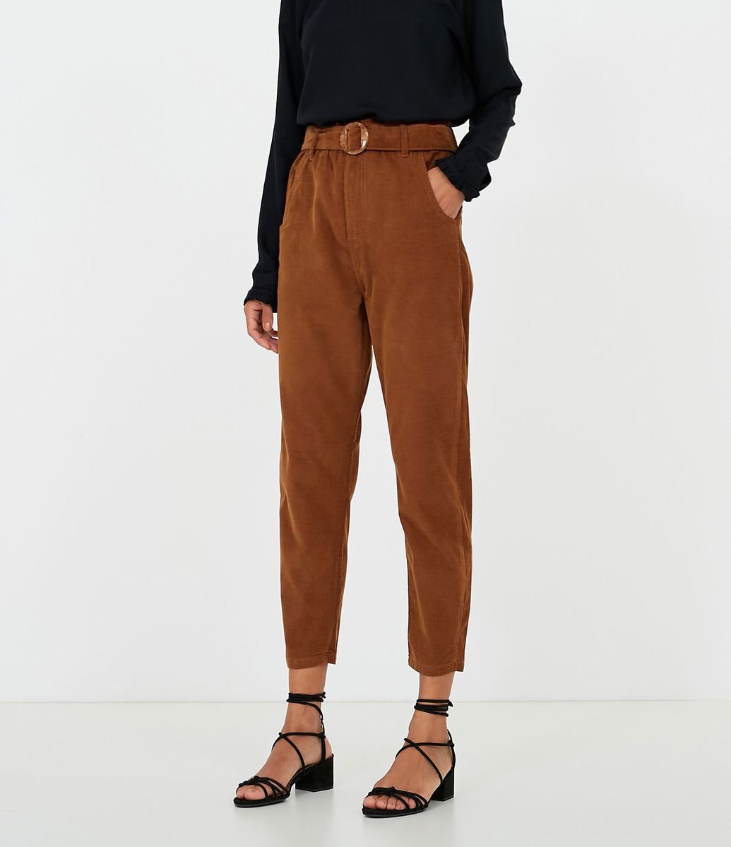 CALÇA CLOCHARD COM CINTO FAIXA E FIVELA MARROM