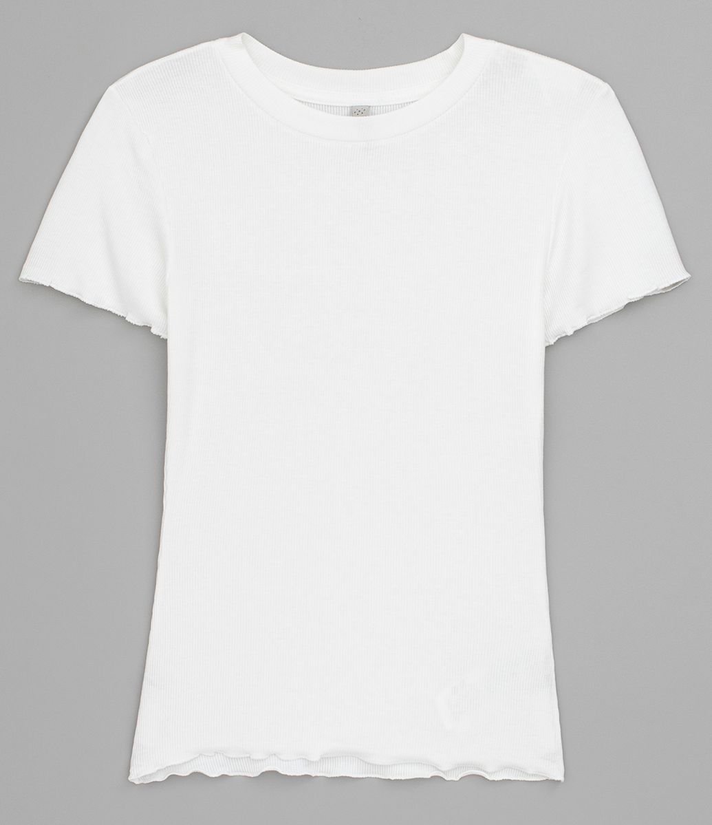 BLUSA BÁSICA EM RIBANA COM EFEITO ONDINHAS NA BARRA BRANCO | Produtos Exclusivos do Loja.Online