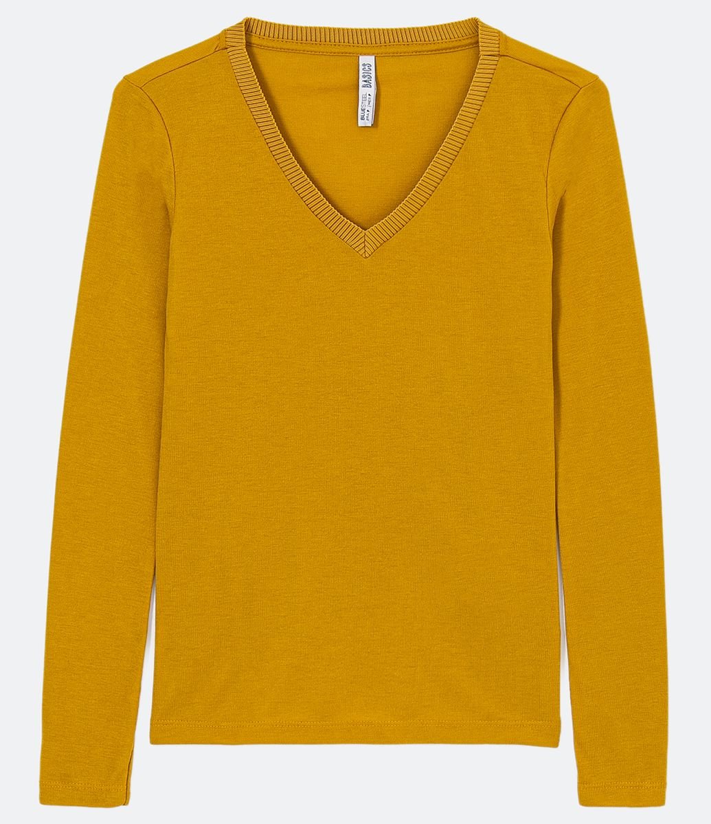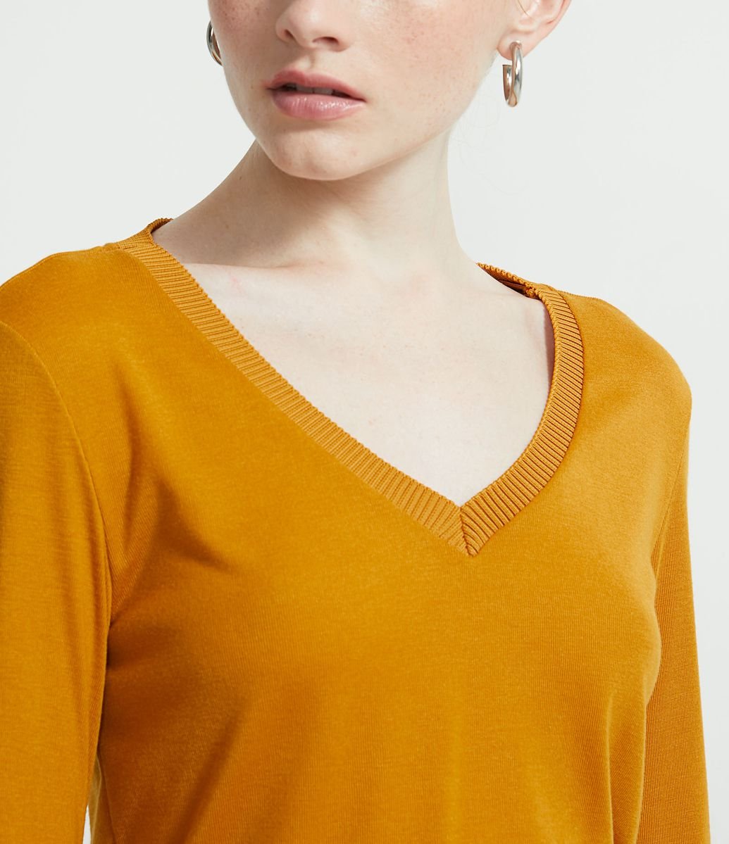 Blusa Básica Manga Longa Com Gola V Em Tricô Amarelo