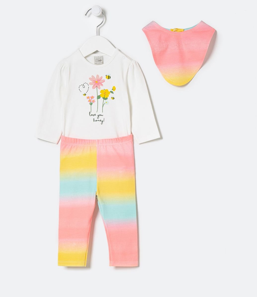 CONJUNTO INFANTIL ESTAMPA DE FLORES E DEGRADÊ COM BABADOR- TAM 0 A 18 MESES BRANCO