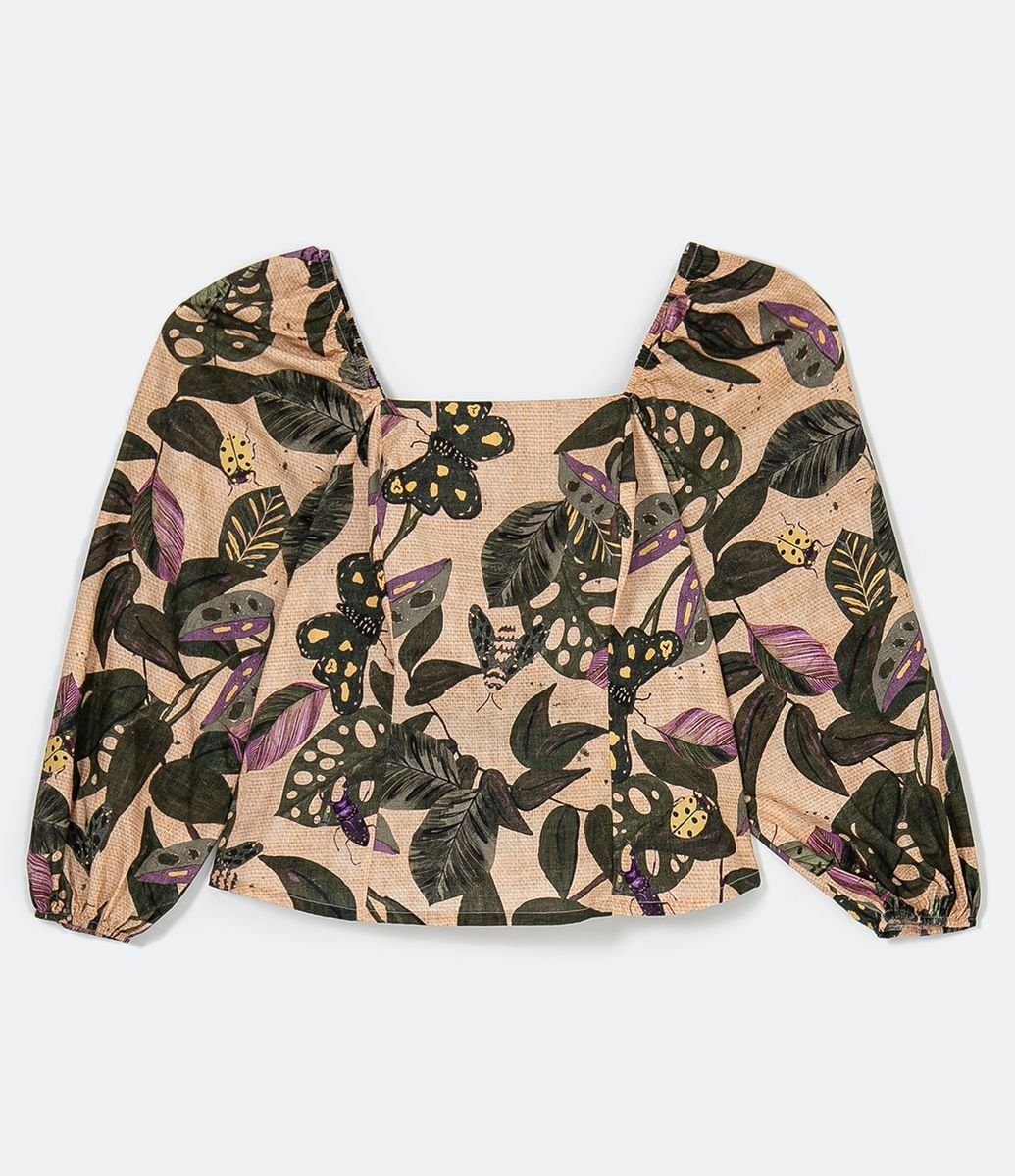 BLUSA MANGA LONGA BUFANTE ESTAMPA FOLHAGENS E BORBOLETAS CURVE & PLUS SIZE BEGE