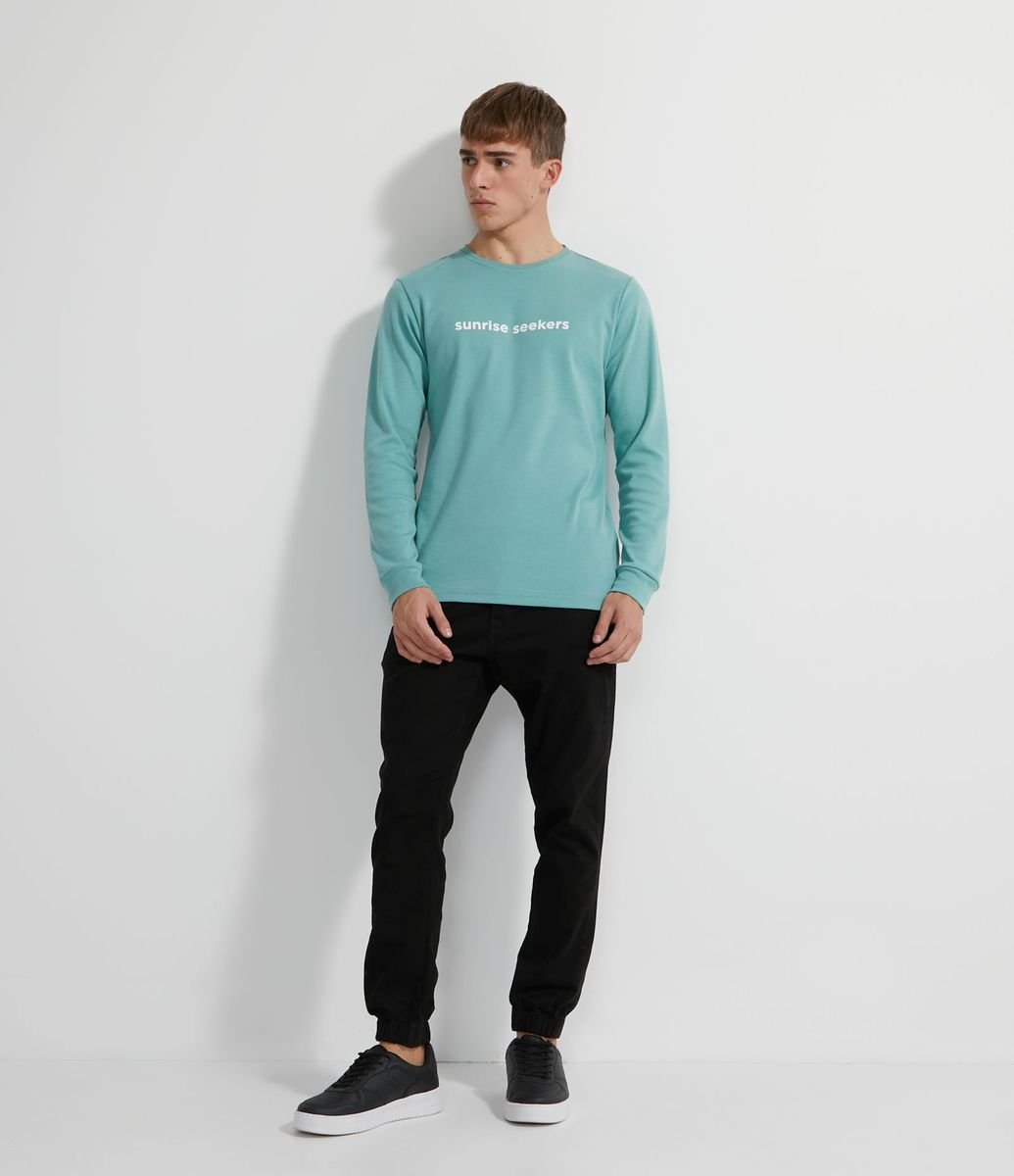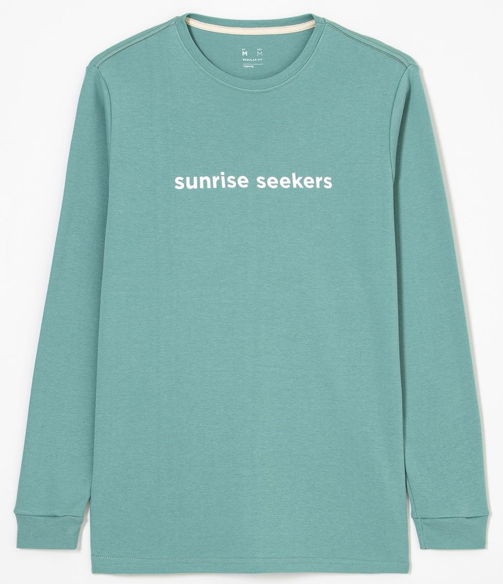 CAMISETA MANGA LONGA EM MOLETINHO ESTAMPA SUNRISE SEEKERS VERDE