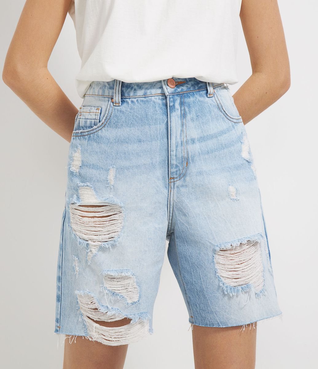 BERMUDA JEANS COM PUÍDOS E BARRA DESFIADA AZUL | Produtos Exclusivos do Loja.Online