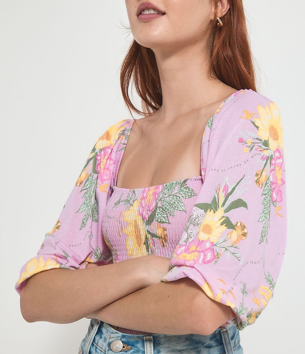 BLUSA CROPPED EM LASTEX ESTAMPA FLORAL ROSA