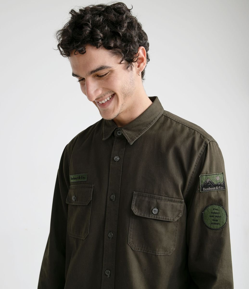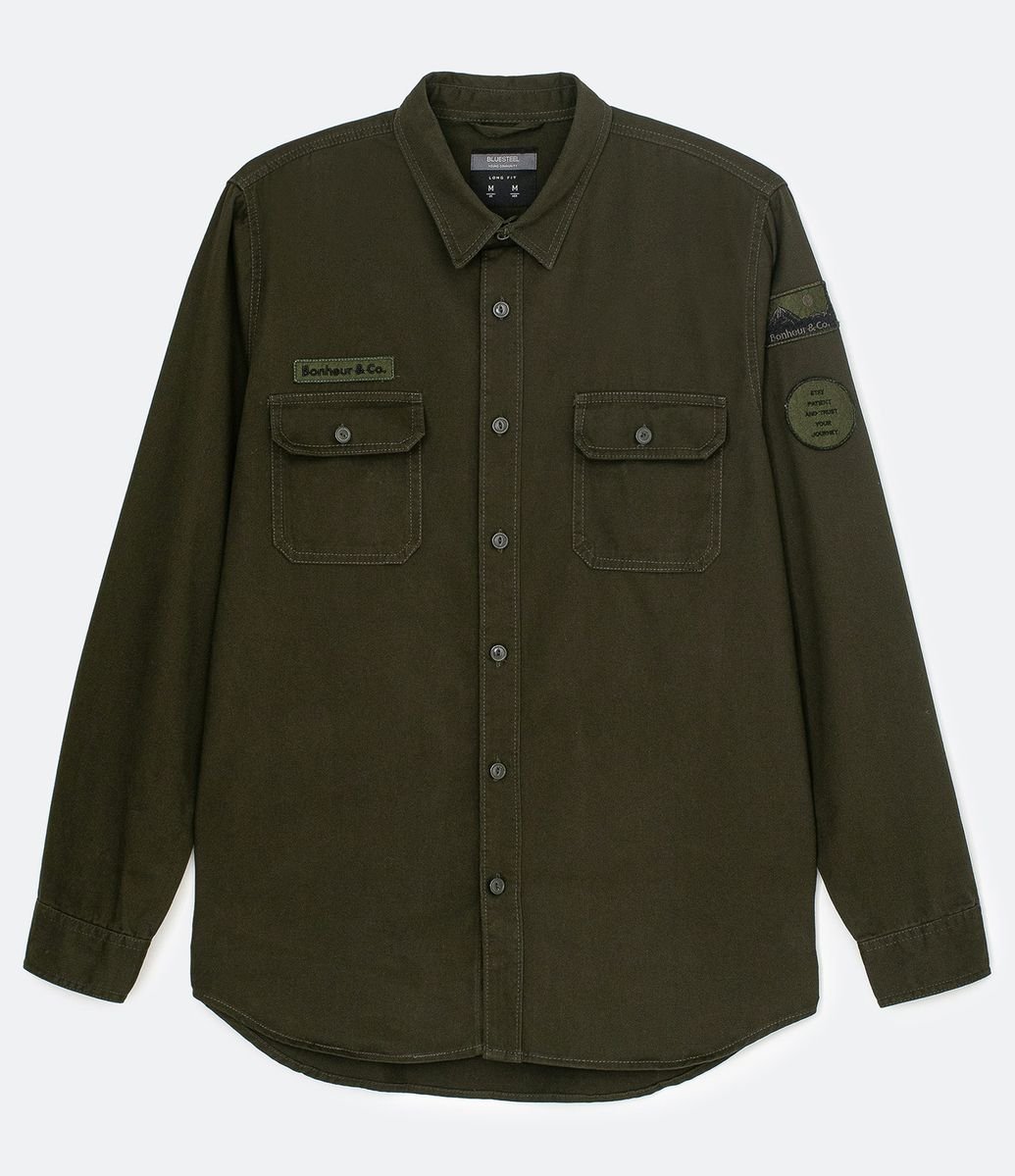CAMISA MANGA LONGA EM SARJA COM PATCHES NA MANGA VERDE ESCURO