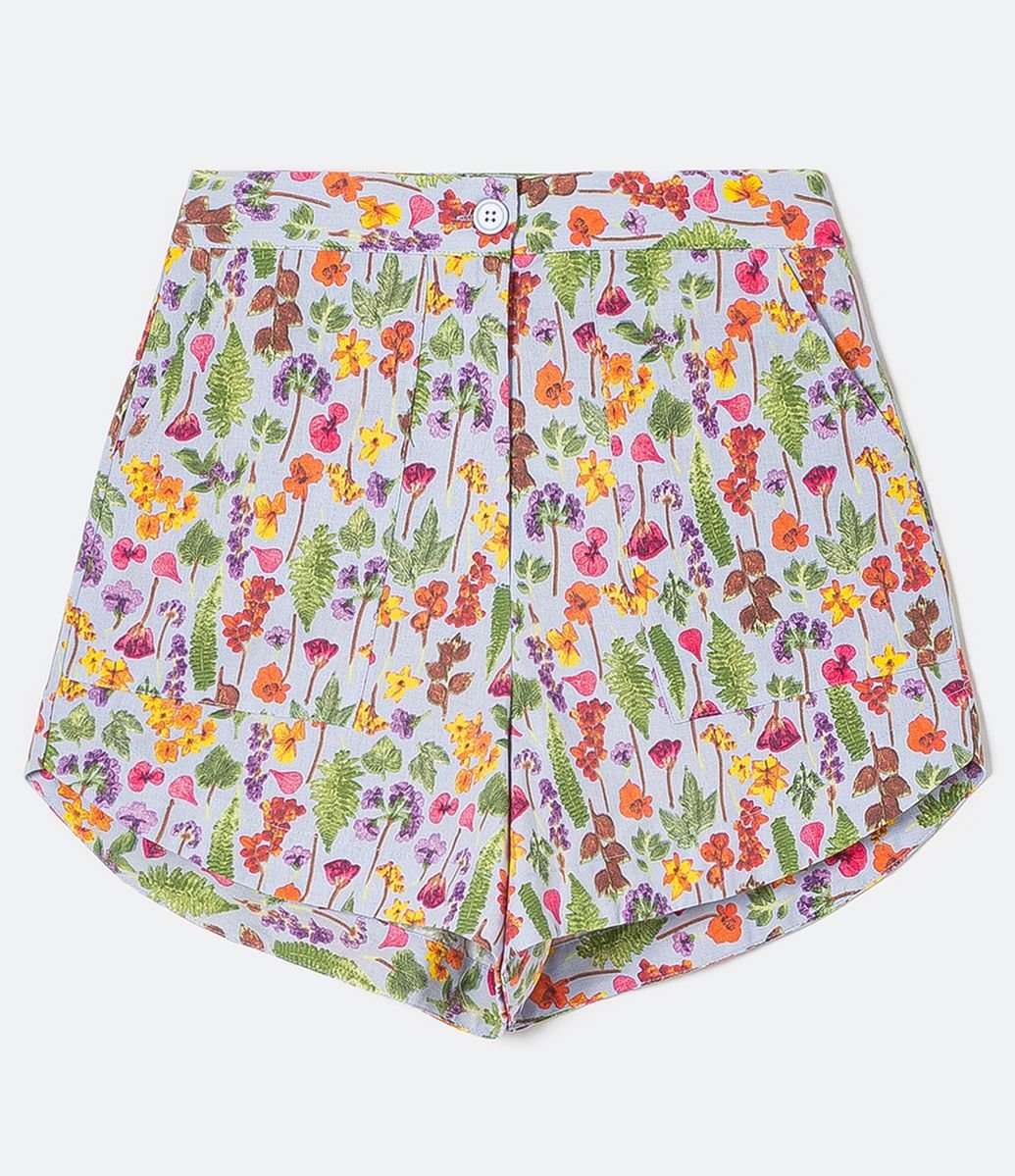 SHORT ALFAIATARIA EM TRICOLINE COM ESTAMPA FLORAL E BOLSOS AZUL