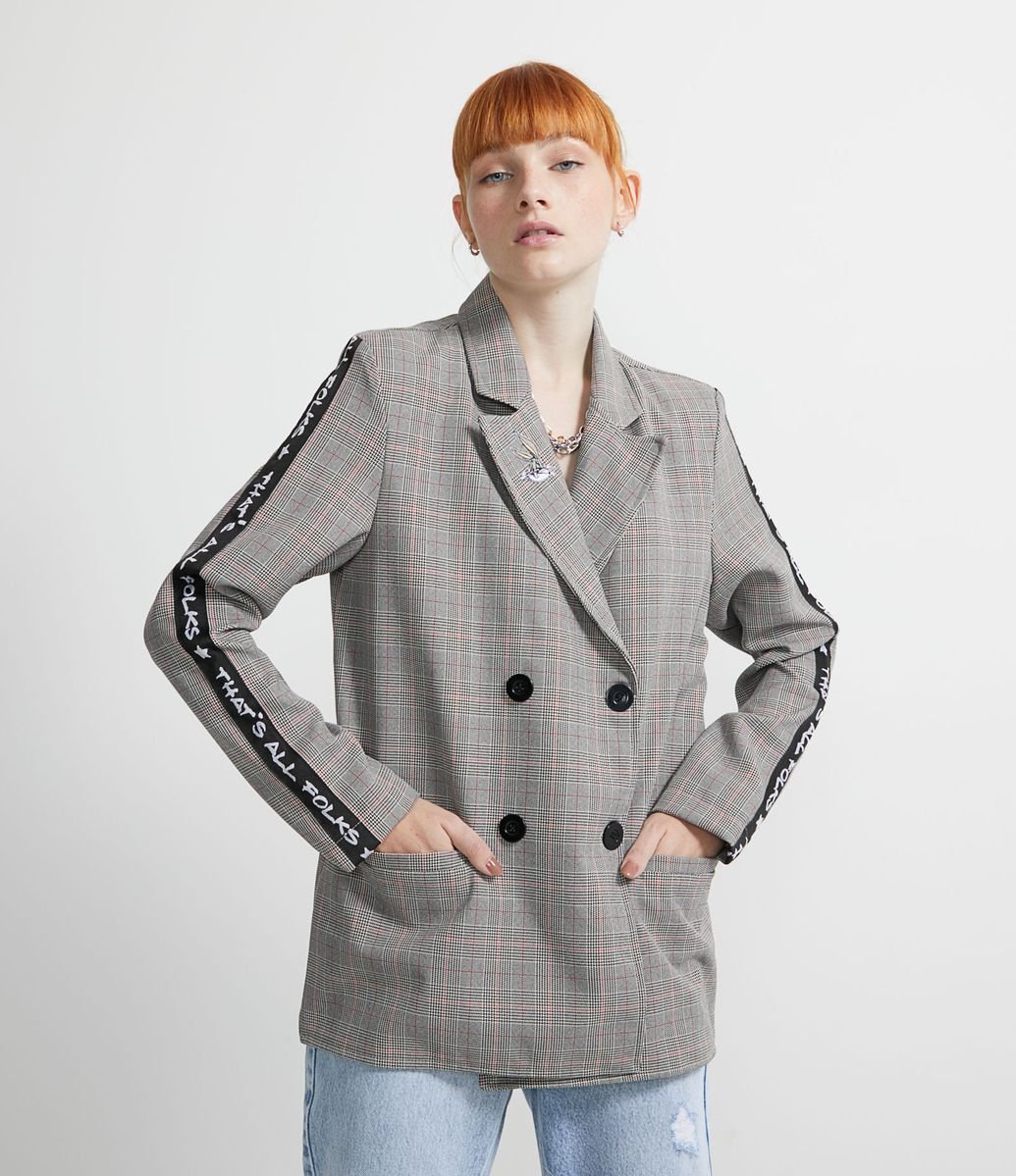 Blazer Alongado Alfaiataria Estampa Xadrez Com Faixa Personalizada E Bordado Pernalonga Cinza