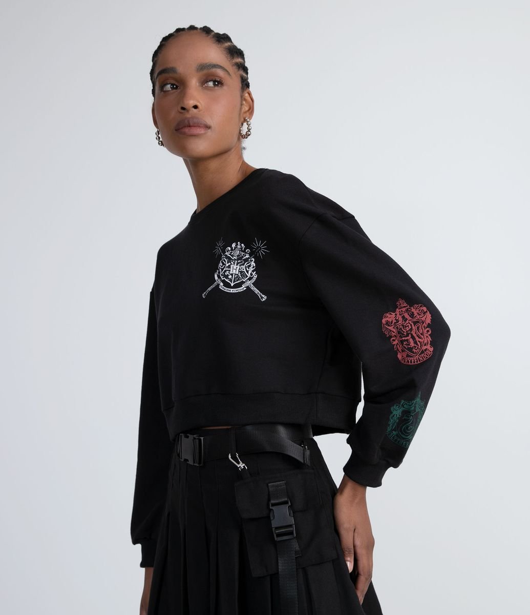 BLUSÃO FECHADO CROPPED EM MOLETOM COM ESTAMPA HARRY POTTER PRETO