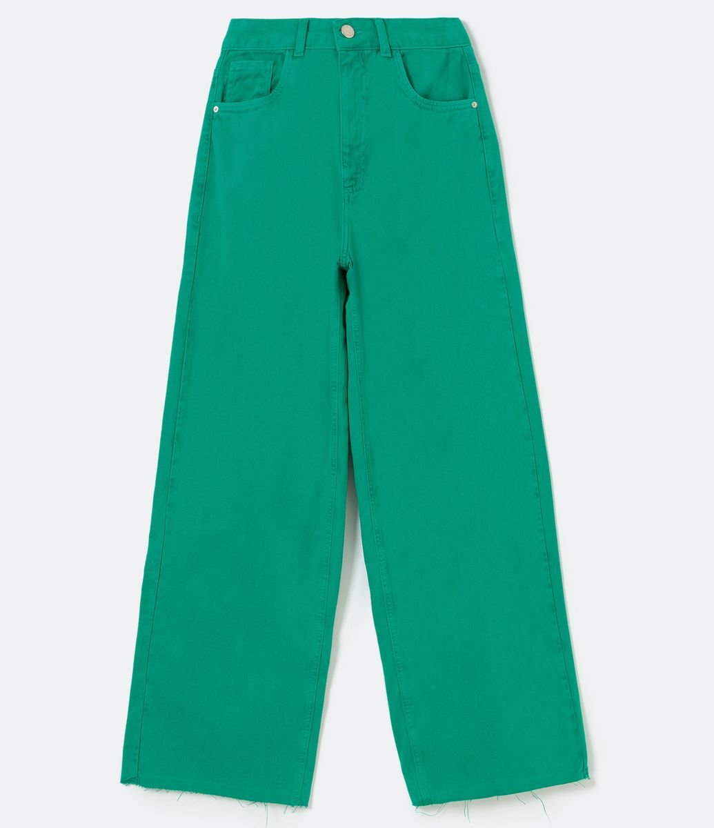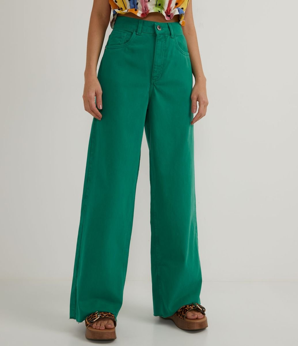 CALÇA WIDE LEG EM SARJA COM BARRA A FIO VERDE