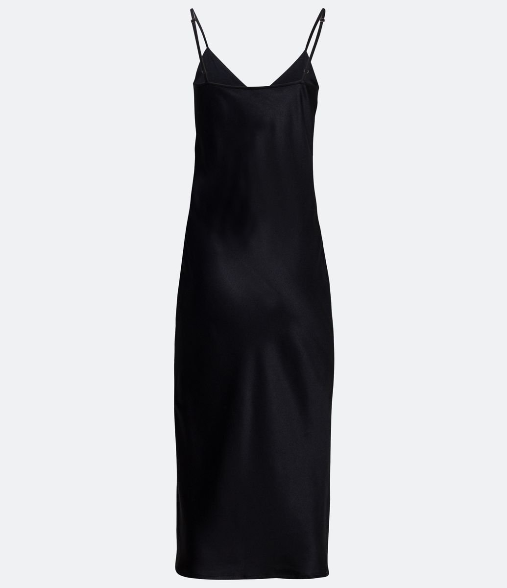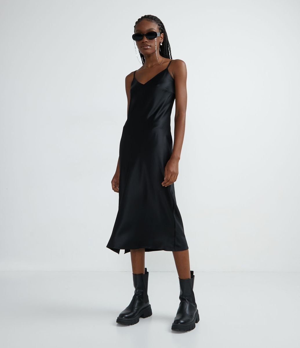 VESTIDO MIDI EM CETIM COM DECOTE V E ALÇA FINA PRETO