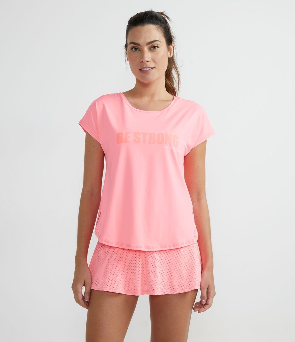 CAMISETA ESPORTIVA EM POLIAMIDA COM ESTAMPA BE STRONG ROSA | Produtos Exclusivos do Loja.Online