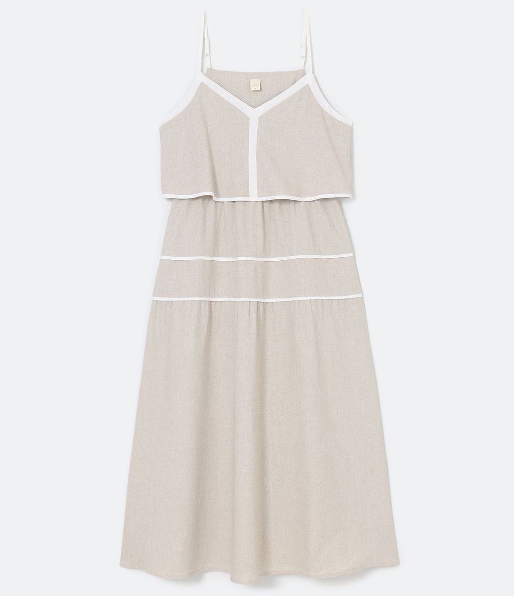 VESTIDO MIDI EM VISCOSE COM DETALHES CONTRASTANTES BEGE | Produtos Exclusivos do Loja.Online