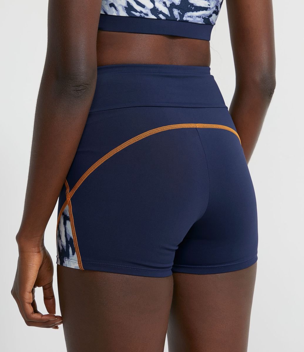BERMUDA ESPORTIVA EM POLIAMIDA COM RECORTES ESTAMPADOS E COSTURAS CONTRASTANTES AZUL