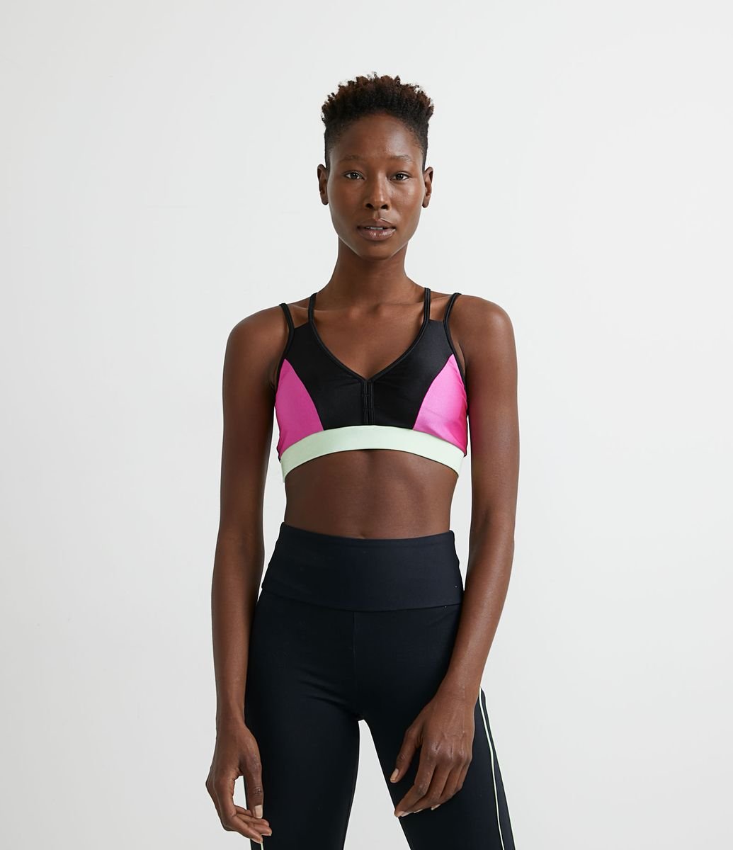 TOP ESPORTIVO EM POLIAMIDA COM BOJO E RECORTES CONTRASTANTES PRETO