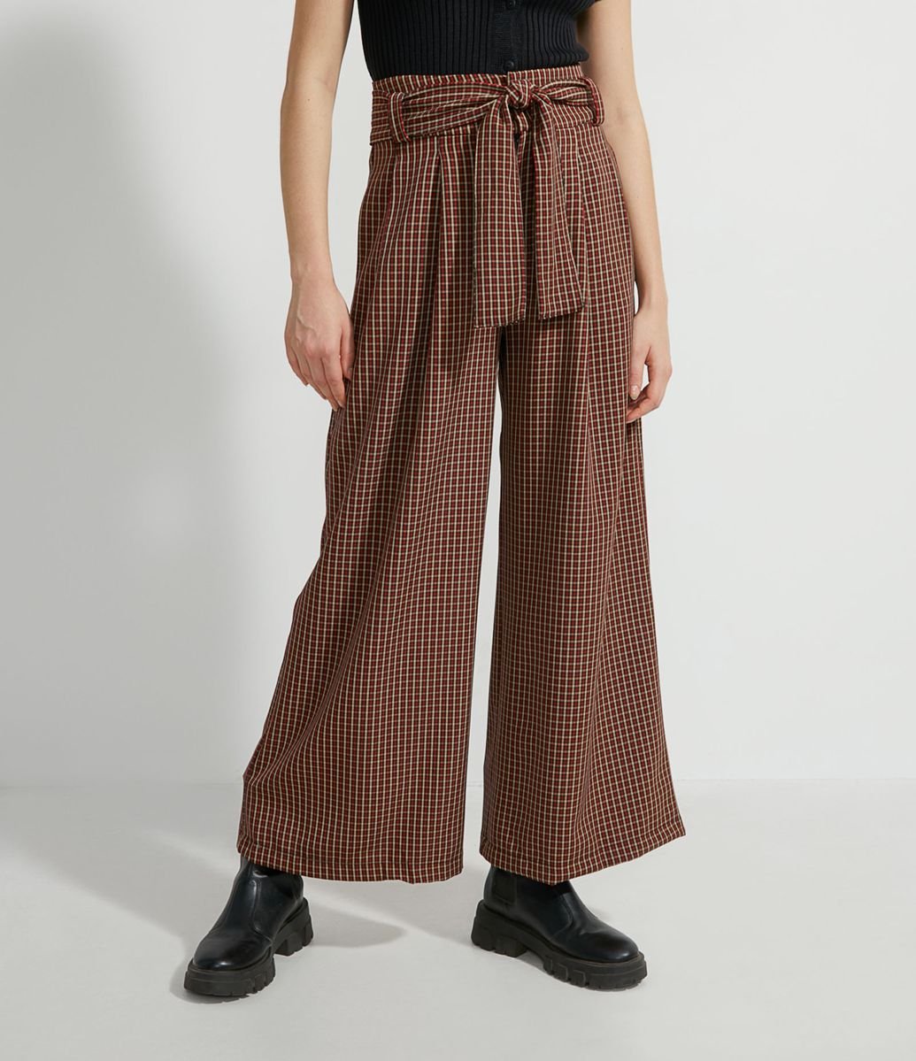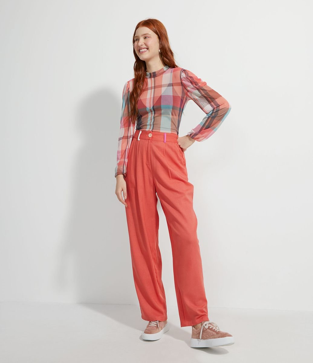 CALÇA PANTALONA ALFAIATARIA COM ESTAMPA XADREZ E CINTO FAIXA VERMELHO