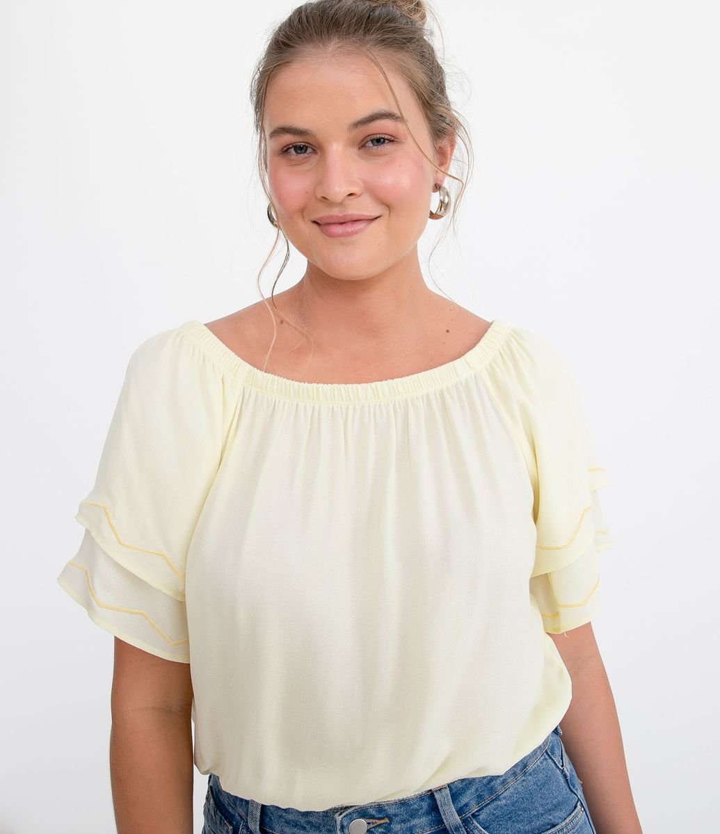 Blusa Lisa Ombro A Ombro Com Bordado Nas Mangas Amarelo