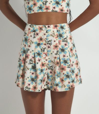 Short Curto Floral com Pregas e Botões Branco - Renner