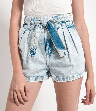 Short Clochard Jeans Liso Marmorizado com Pregas e Cinto Fixo Azul - Renner