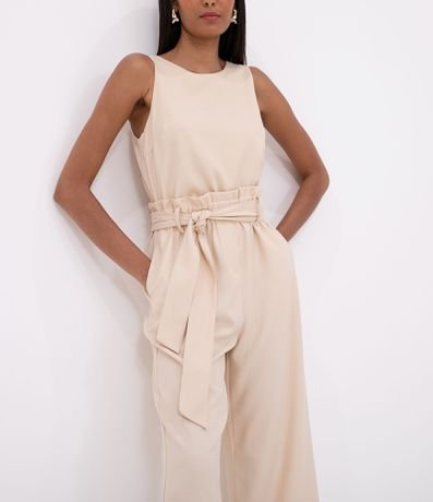 Macacão Liso Pantacourt com Decote V e Faixa Bege - Renner