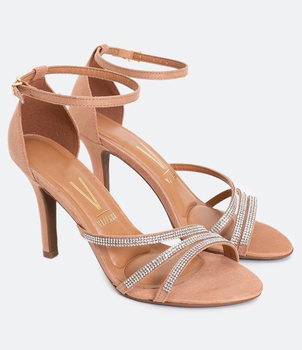 SANDALIA FEMININA SALTO FINO COM TRÊS TIRAS EM STRASS VIZZANO BEGE