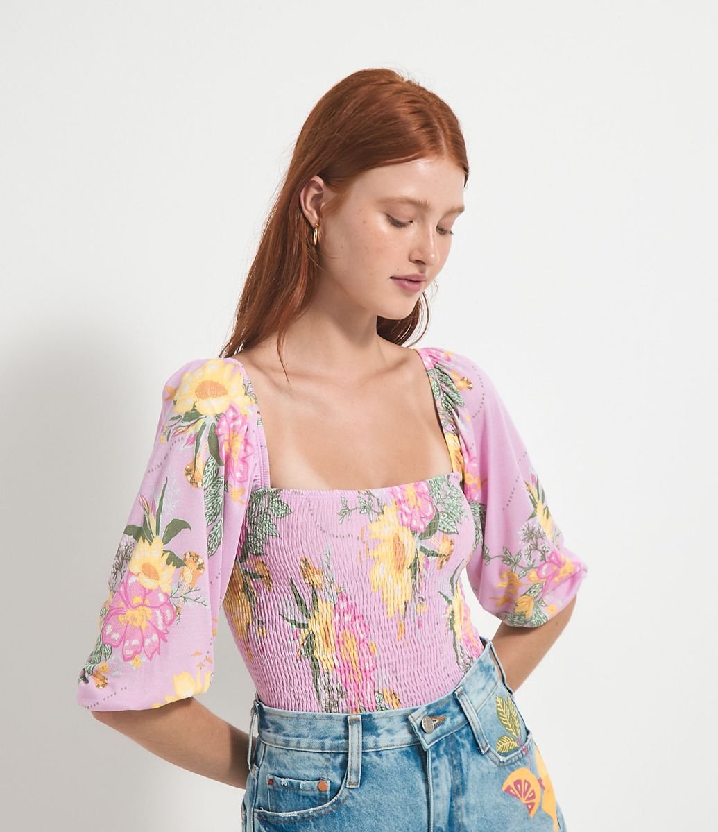 BLUSA CROPPED EM LASTEX ESTAMPA FLORAL ROSA