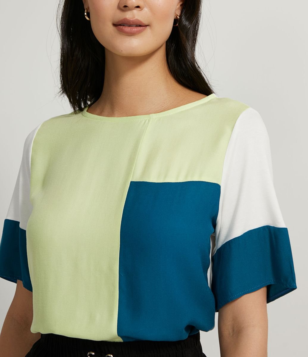 BLUSA MANGA CURTA EM VISCOSE COM RECORTES CONTRASTANTES AMARELO