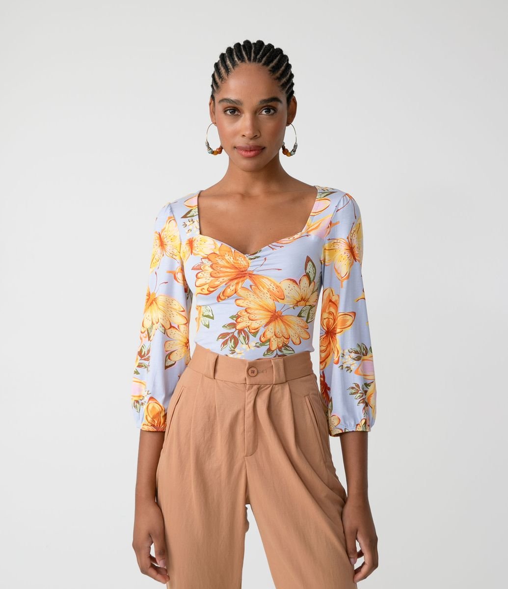 BLUSA EM VISCOLYCRA COM ESTAMPA FLORAL E MANGA LONGA BUFANTE AZUL