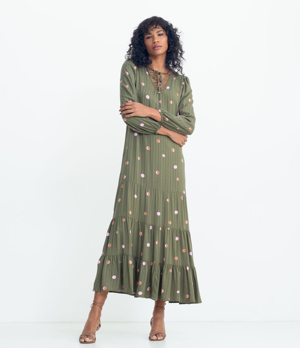 VESTIDO LONGO EM VISCOSE POÁ COM MANGA LONGA E BABADOS NA BARRA VERDE