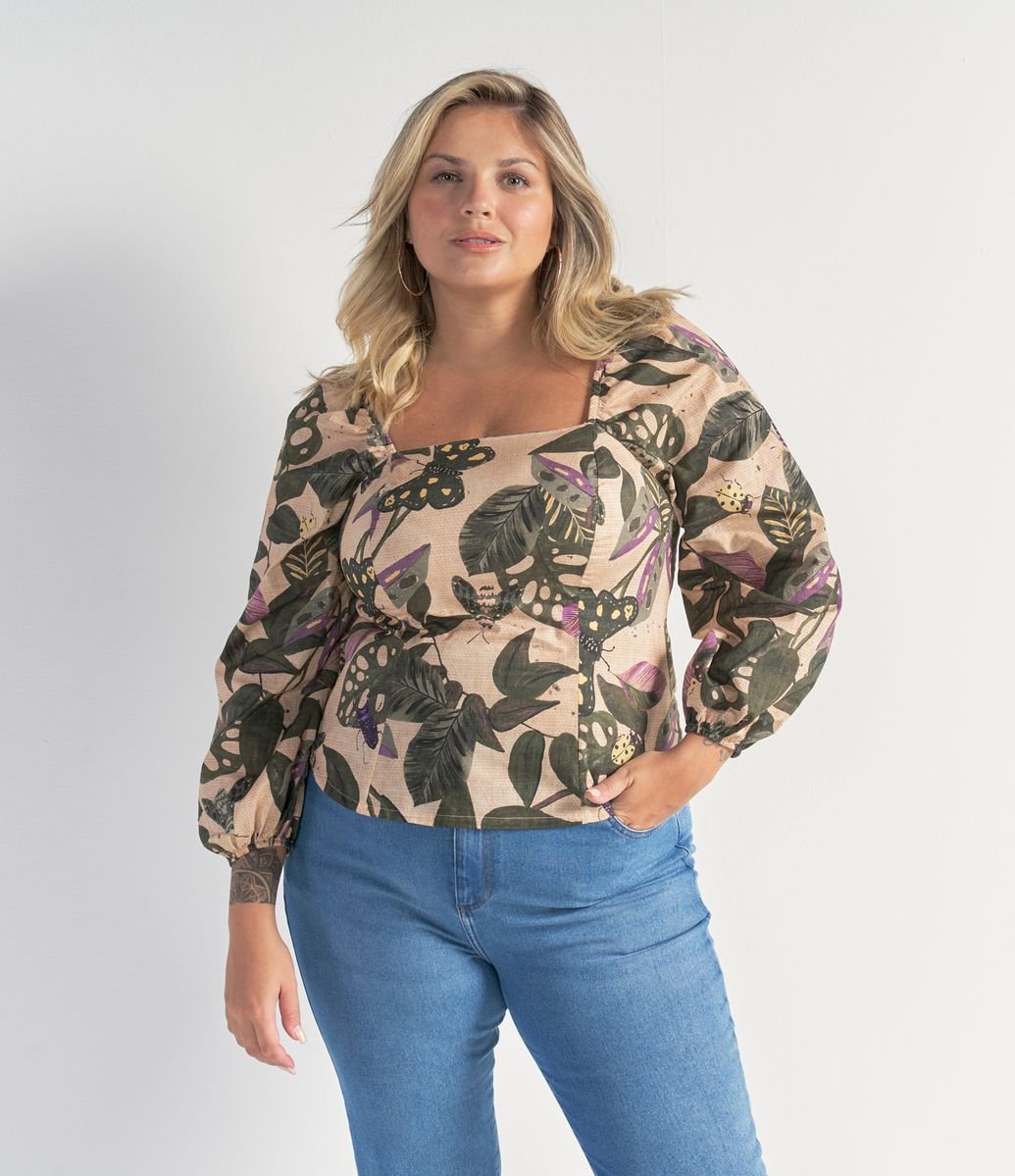 BLUSA MANGA LONGA BUFANTE ESTAMPA FOLHAGENS E BORBOLETAS CURVE & PLUS SIZE BEGE