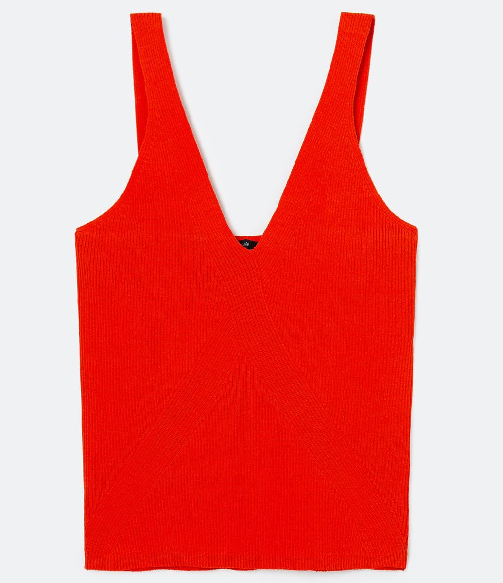 Blusa Regata em Tricô Canelado com Decote V Laranja