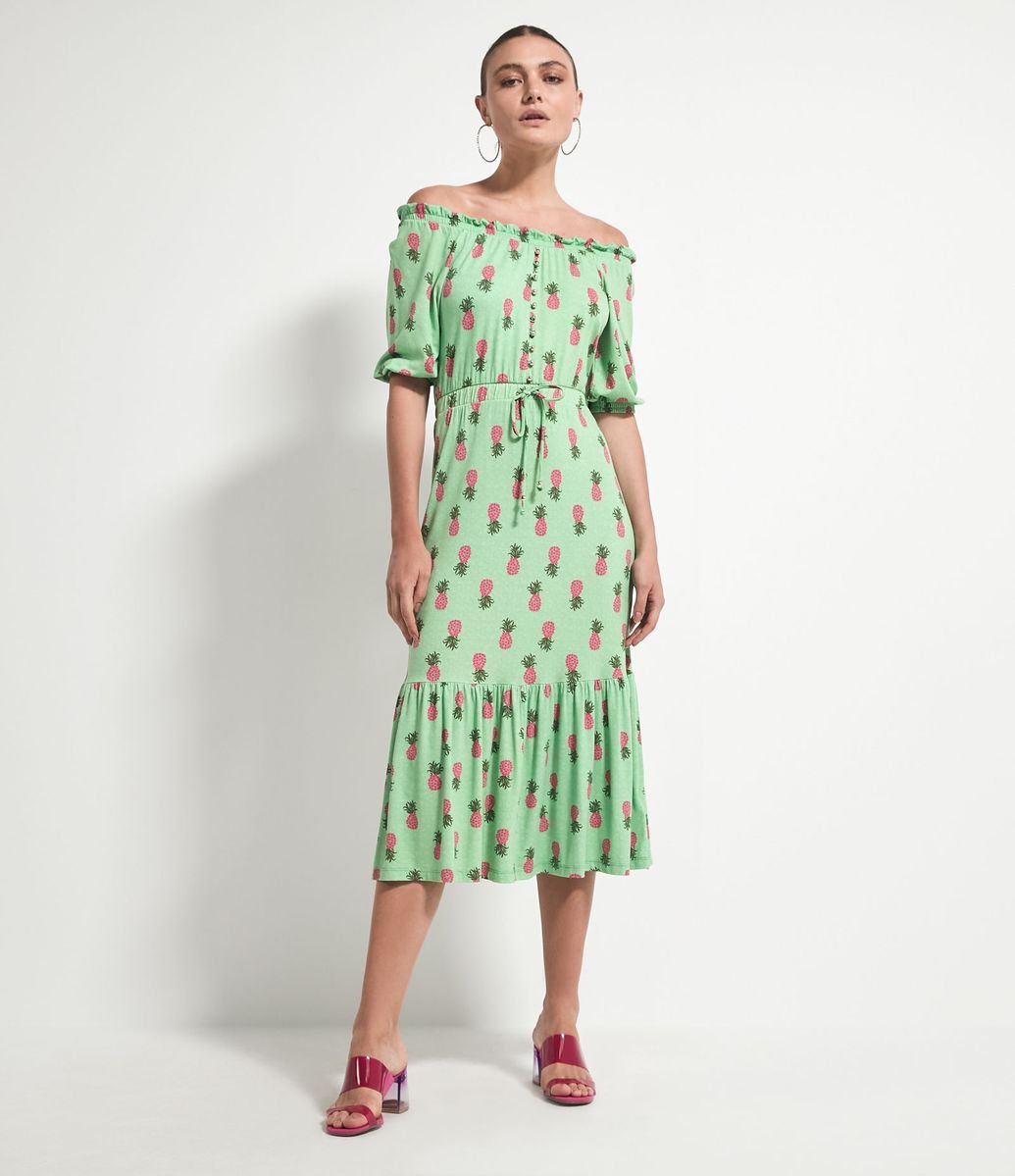 VESTIDO MIDI OMBRO A OMBRO ESTAMPA ABACAXIS COM AMARRAÇÃO VERDE