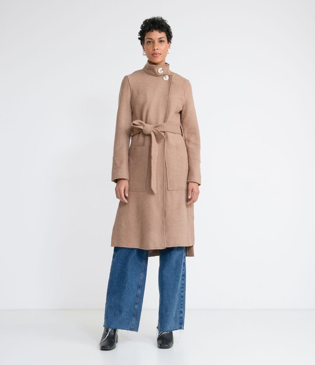 Casaco Alongado Em Lã Com Gola Alta E Cinto Faixa Marrom