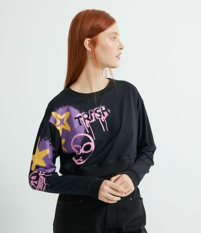 Blusa Cropped Manga Longa em Algodão Estampa Grafitti ET Trash Preto - Renner