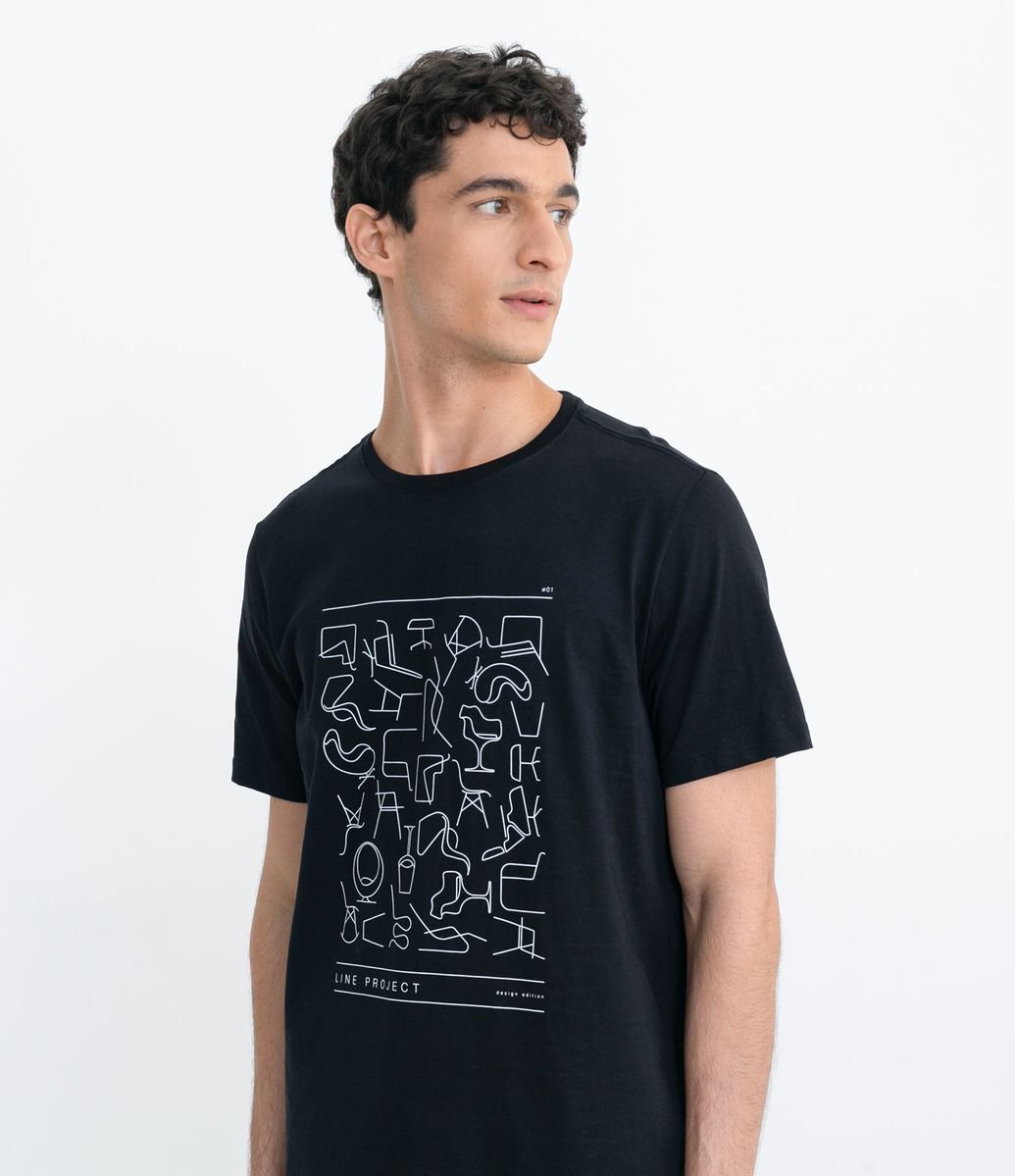 Camiseta Manga Curta Em Algodão Peruano Estampa Cadeiras Preto